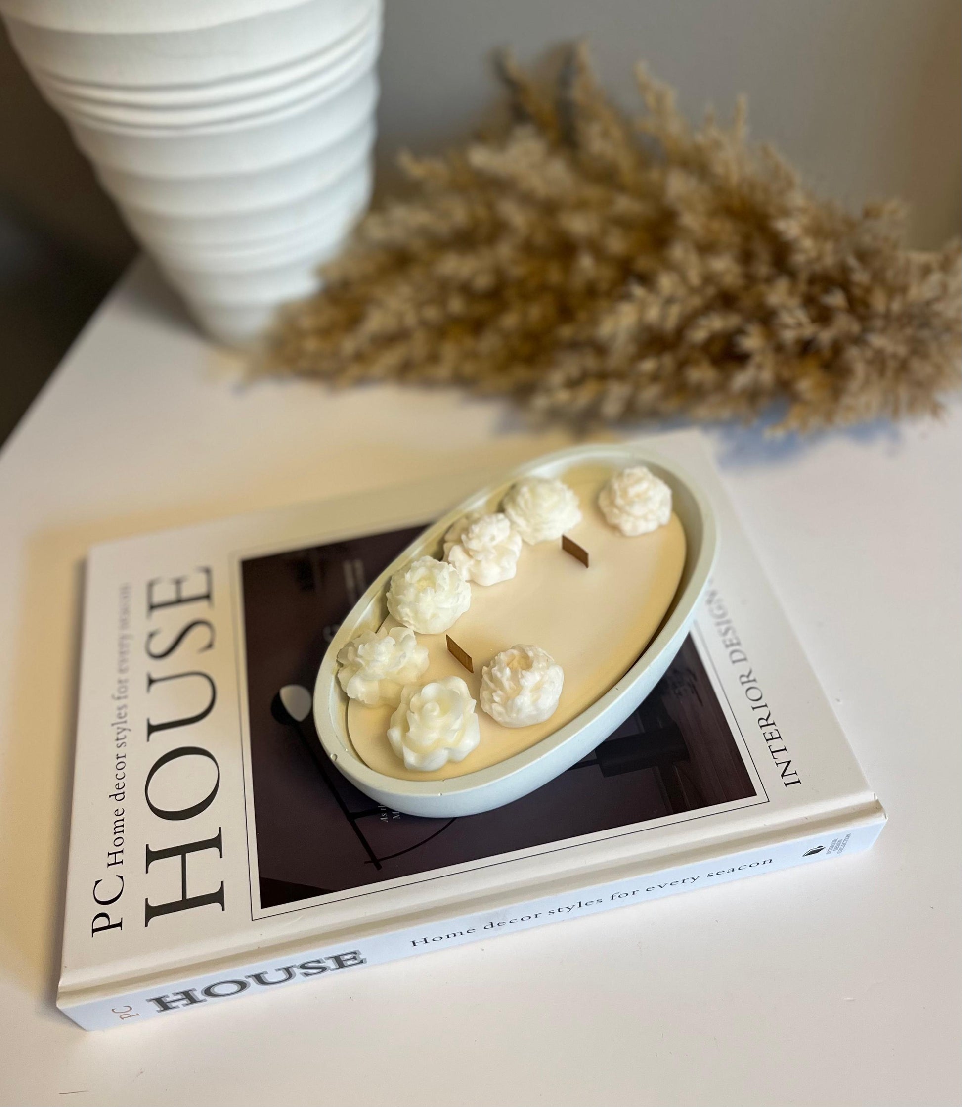 Our White Blossom candle is a stunning standalone piece, housed in a beautifully handcrafted container that enhances its sophistication and charm.